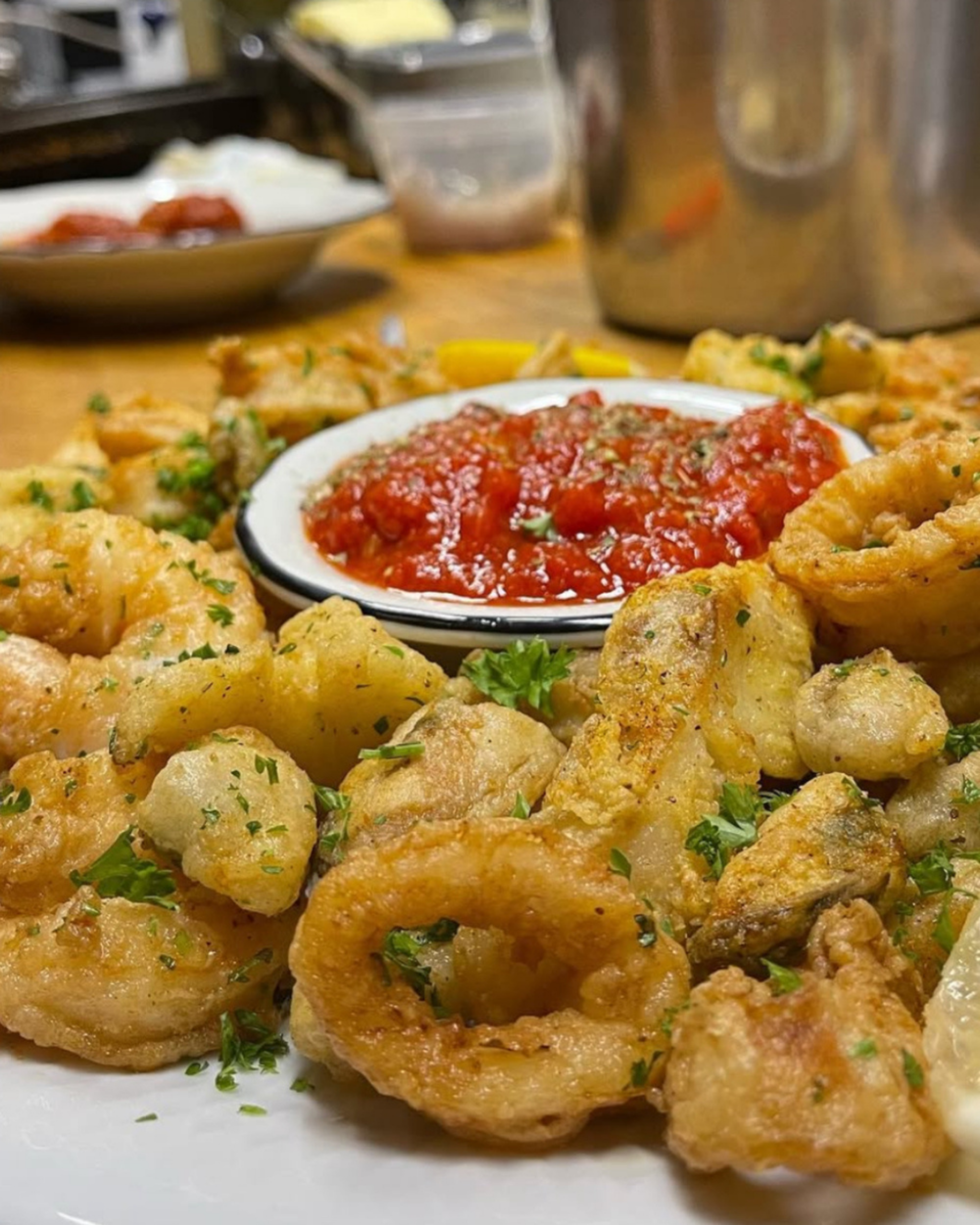 Black paella with cuttlefish, prawns, and squids in cuttlefish ink